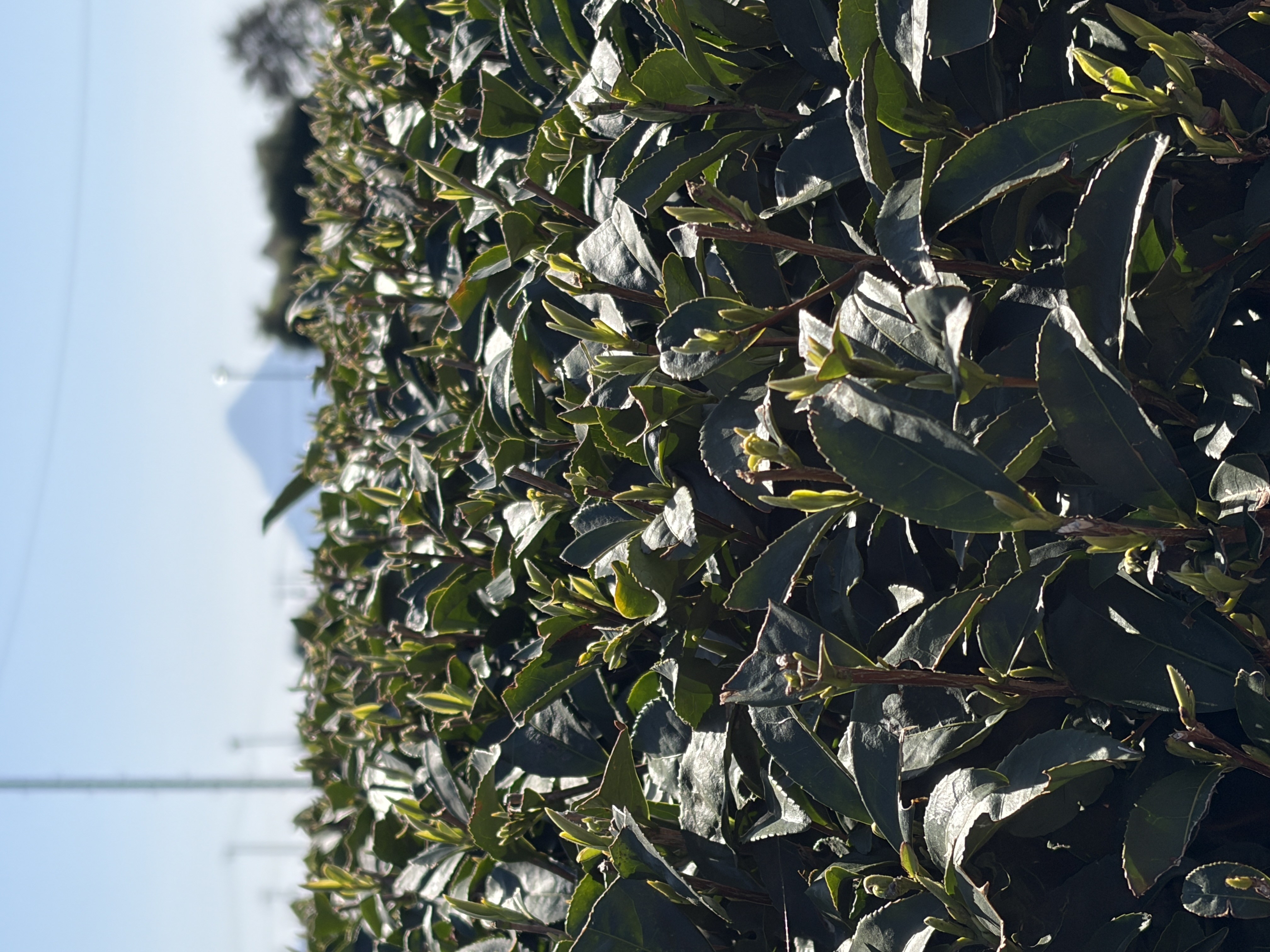 Fresh tea buds are sprouting; these small, yellowish-green shoots will eventually grow and be processed into matcha.